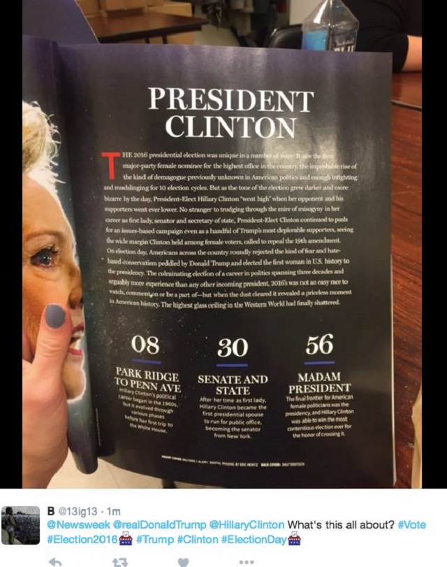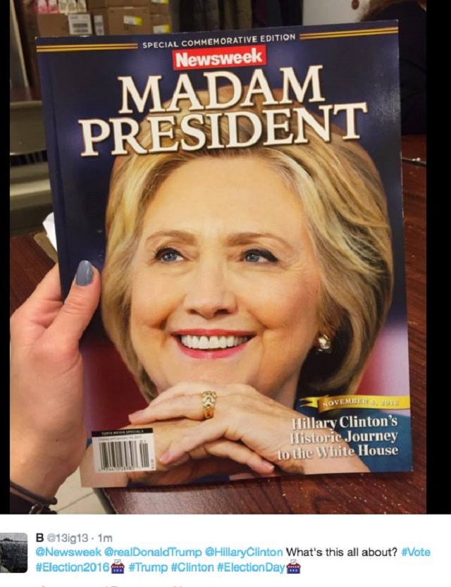 Publicaţia „Newsweek” susţine că Hillary Clinton, cea care reprezintă Partidul Democrat, va câştiga cursa prezidenţială. Într-o ediţie specială, revista a apărut pe copertă cu fotografia lui Hillary şi cu un titlu sugestiv: „Doamna preşedinte”.