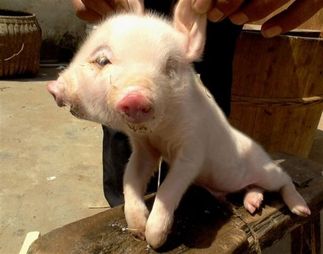 Un porcuşor s-a născut cu două capete unite, două nasuri, două guri şi trei ochi în provincia Jianxi, din China. Fermierul Du Gensheng a rămas fără suflare atunci când minunea şi-a făcut apariţia în curtea lui. El se amuză de fiecare dată când purceluşul minune vrea să sugă lapte deoarece nu ştie cu care dintre râturi să bea. Doctorii veterinari sunt sceptici cu privire la supravieţuirea animalului.