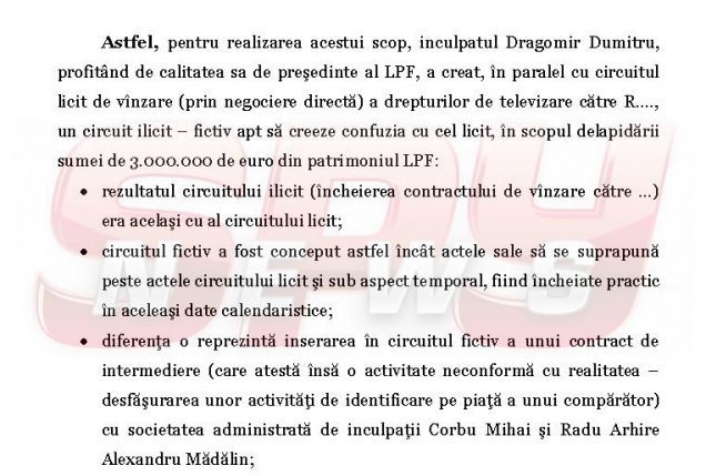 5. Dumitru Dragomir prezintă membrilor Adunării Generale, la 27 iunie 2011, oferta depusă de RDS-RCS ca fiind rezultatul negocierilor purtate de SC Capital Properties SRL, inducându-i astfel în eroare cu privire la prestarea unor servicii de către această societate. "O societate a adus „RDS-ul” şi o să primească de la LPF „un comision de succes de până în 5%”, le-ar fi spus Dragomir membrilor LPF.