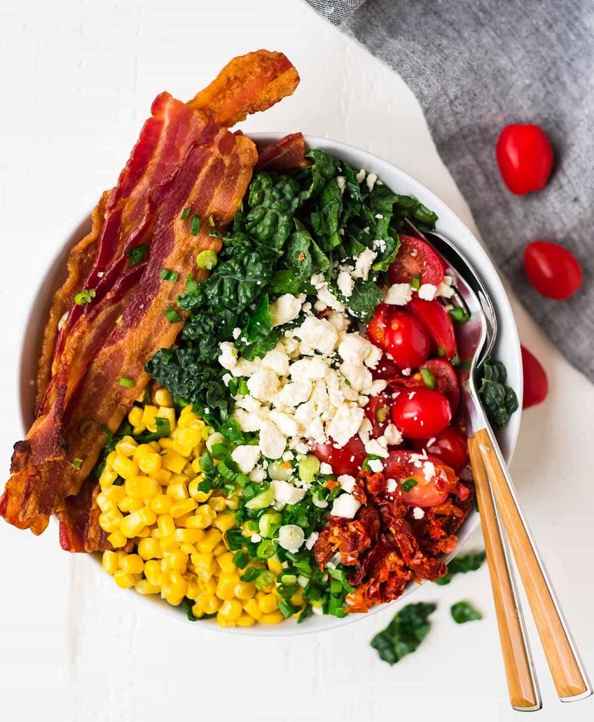 Într-o tigaie, la foc mediu se prăjește baconul, aproximativ trei minute pe fiecare parte. După ce acesta s-a rumenit, se scoate pe o farfurie și după ce s-a răcit complet se taie în bucăți mici. Între timp, se pun roșiile uscate într-un castron cu apă pentru ca acestea să se hidrateze.. Apoi, într-un castron mare, se adaugă baconul, salata, roșiile uscate, roșiile cherry, boabele de porumb, brânza și ceapa verde.
