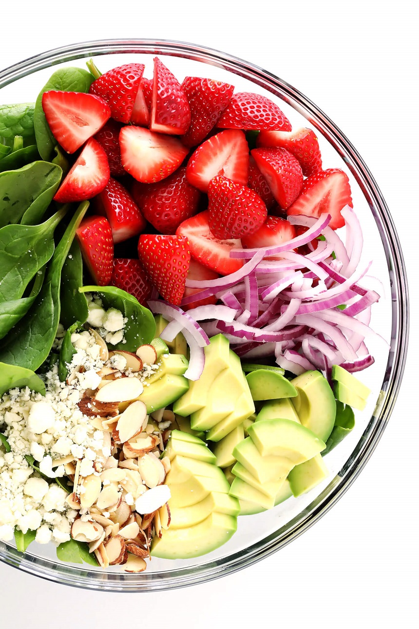 Într-un bol mare de servire, se combină spanacul, căpșunile, avocado, migdalele, ceapa și brânza gorgonzola. Într-un bol mic se pun uleiul de măsline, oțetul balsamic, mierea, semințele de mac, sarea și piperul. Se amestecă până ce toate ingredientele se combină, apoi se adaugă peste spanac și fructe. Se servește imediat.