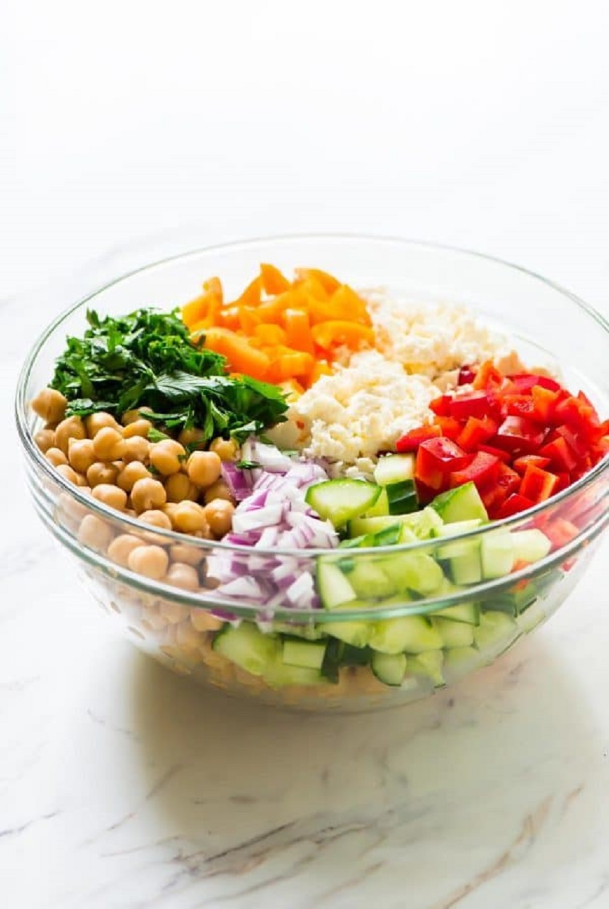 Pentru început, se pune cepa într-un bol mic cu apă și se lasă deoparte timp de 10 minute. Între timp, într-un bol mare pentru servire, se pune năutul, ardeiul, castravetele și brânza feta. Într-un castron mic, se amestecă uleiul de măsline, oțetul balsamic, usturoiul, oregano, sare și piper. Se curge apa în care a stat ceapa și apoi se adaugă peste celelalte legume, apoi se adaugă amestecul de oțet și ulei peste legume și se amestecă până ce toate ingredientele se combină. Se refrigerează timp de 30 de minute înainte de servire.