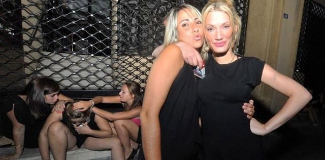 În fotografie le puteţi vedea pe blonde cum zâmbesc la cameră, iar în spatele lor cum o tânără vomită. Fata este asistată de alte două prietene care încearcă să o ajute să-şi revină.