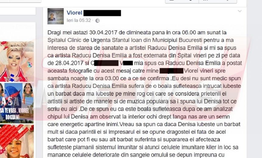 (...) Eu deşi nu sunt medic spun că artista Răducu Denisa Emilia suferă de o boală sufletească întrucât iubeşte un bărbat. Dacă mă iubeşte pe mine, rog cei care se consideră prietenii ei, artişti şi artiste de manele şi de muzică popular să-i spună lui Denisa tot ce scriu eu aici. De ce spun eu că este boala sufletească: după ce am analizat chipul lui Denisa, am observat la interior ochi drept lângă nas, are un semn care energetic aparţine inimii. Vreau să spun că dacă Denisa iubeşte un bărbat mult şi dacă părinţii ei şi impresarul ei se opune dragostei ei faţă de acel bărbat care pot fi eu sau alt bărbat suferinţa şi supărarea ei afectează sufleteşte plămânii, sistemul imunitar şi atunci celulele imunitare killer în loc să mănânce celulele deteriorate din sângele omului se depun împreună cu celulele imunitare tip T şi B pe pereţii vaselor de sânge împreună cu colesterolul LDL cel rău ce duce la îngustarea vaselor de sânge şi ajunge mai puţin sânge la inimă şi cap ce poate da boli de inimă şi boli de cap dacă boala sufletească, cauza, nu este înlăturată. Dacă Denisa nu este lasată să ia ce decizii doreşte cu viaţa ei, cei care se vor opune - părinţii, impresarul - o vor avea pe conştiinţă dacă i se întâmpla ceva rău", a avertizat "Stăpânul lumii" de la Slobozia.