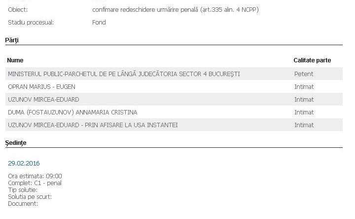 Numai că, în cele din urmă, cei ar putea să stea din nou faţă în faţă. E drept, într-un dosar penal pe care procurorii Parchetului de pe lângă Judecătoria Sectorului 4 vor să-l deschidă pe numele celor doi. La mijloc, afacerile fostului cuplu în care ar fi fost implicat şi Eugen Marius Opran. Oamenii legii le-au cerut judecătorilor redeschiderea cercetărilor în cazul unei sesizări existente pe numele celor trei. Solicitarea acestora va fi judecată la finalul lunii februarie.