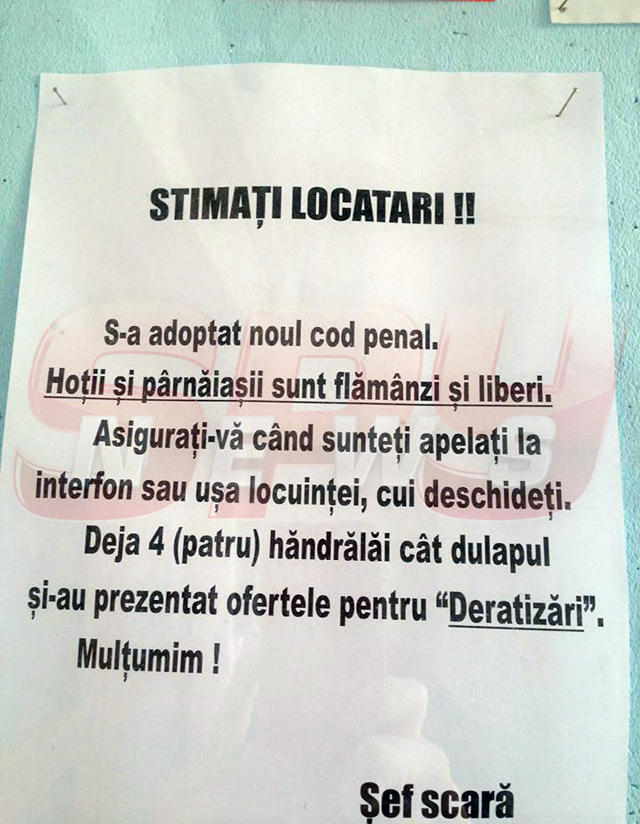 "Hoţii şi pârnăiaşii sunt flămânzi şi liberi", spune anunţul de pe scara unui bloc. Administratorii de bloc sunt cu ochii în patru de când noul Cod Penal a intrat în vigoare. Mai mult decât atât, un şef de scară a semnalat deja prezenţa unor dubioşi, nu mai puţin de patru "hăndrălăi cât dulapul", care şi-au oferit serviciile, de deratizare, locatarilor. Nu vă faceţi griji, şefii de scară sunt vigilenţi şi vă apară de infractorii periculoşi!