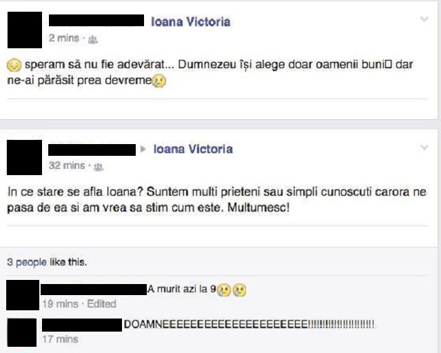 Chiar după ce fata a murit, cineva a întrebat pe profilul său de facebook cum se simte, încercând să se ţină la curent. Probabil nu s-a aşteptat la răspunsul pe care l-a primit. Unul dintre apropiaţii săi i-a dat vestea: "A murit azi la 9".