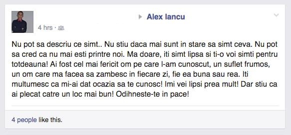 Prietenii au fost copleşiţi de moartea tânărului şi şi-au exprimat regretele profunde în mesaje răvăşitoare. Iată o parte dintre gândurile înşirate de prietenii lui Alex Iancu pe o reţea de socializare: