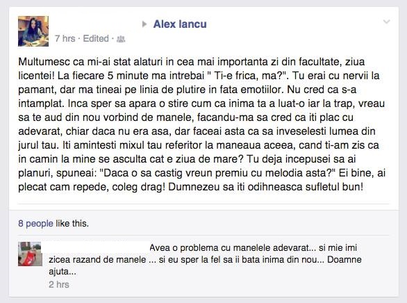 "Mulţumesc că mi-ai stat alături în cea mai importantă zi din facultate, ziua licenţei! La fiecare 5 minute mă întrebai: "Ţi-e frică, mă?". Tu erai cu nervii la pământ, dar mă ţineai pe linia de plutire în faţa emoţiilor. Nu-mi vine să cred că s-a întâmplat. Încă sper să apară o ştire cum că inima ta a luat-o iar la trap, vreau să te aud din nou vorbind de manele, făcându-mă să cred că-ţi plac cu adevărat chiar dacă nu era aşa, dar făceai asta ca să înveseleşti pe toată lumea din jurul tău. Îţi aminteşti micul tău referitor la maneaua aceea, când ţi-am zis că la mine în cămin se ascultă cât e ziua de mare? Tu deja începusei să ai planuri, spuneai: "Dacă o să câştig vreun premiu cu melodia asta?" Ei bine, ai plecat ca repede, coleg drag! Dumnezeu să îţi odihnească sufletul bun"