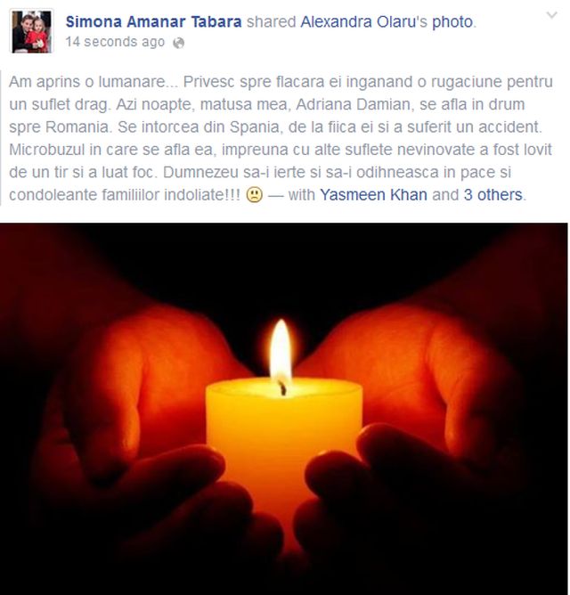 "Am aprins o lumânare... Privesc spre flacăra ei îngânând o rugăciune pentru un suflet drag! Azi noapte, mătuşa mea, Adriana Damian, se afla în drum spre România. Se întorcea din Spania, de la fiica ei şi a suferit un accident. Microbuzul în care se afla ea, împreună cu alte suflete nevinovate a fost lovit de un tir şi a luat foc. Dumnezeu să-i ierte şi să-i odihnească în pace şi condoleanţe familiilor îndoliate", este mesajul publicat de fosta gimnastă.