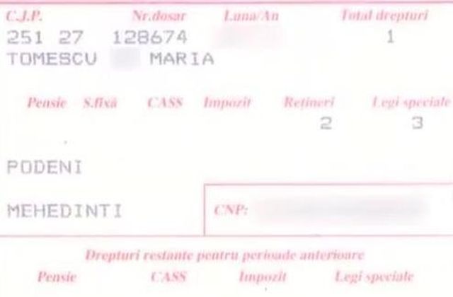 "Soţul meu a lucrat la achiziţii în mină. Atunci când a mers să-şi scoată adeverinţă, doamna de acolo i-a dat adeverinţă cu data de când a mers să scoata actul, nu din ziua în care el s-a angajat. A greşit şi el nu şi-a dat seama. După ce a murit el, am făcut o reclamaţie şi mi-au zis să mai aduc o adeverinţă, însă eu nu am mai avut de unde pentru că arhivele au fost arse la revoluţie. 2 lei sunt reţineri pentru banii pe care statul zice că eu îi primesc abuziv.