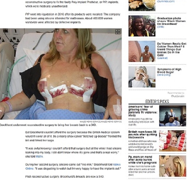 Kim Brockhurst, o instructoare de fitness din Marea Britanie, a vrut să-şi îndeplinească un vis şi a plătit 7.000 de dolari pentru operaţia la sani, conform Mirror. Femeia trăieşte un adevărat coşmar, deoarece după ce s-a trezit din anestezie, ea avea sânii mult mai mari decât a cerut. Implanturile i-au explodat, iar siliconul i s-a scurs în organism, punându-i viaţa în pericol.