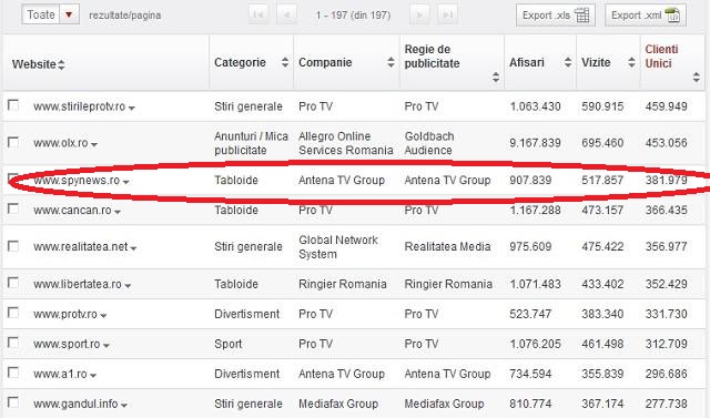Succesul nostru este cu atât mai mare cu cât, ieri, ne-am poziţionat pe locul II în topul site-urilor de conţinut, după site-ul ştirileprotv.ro. Spynews.ro se poate lăuda că a ajuns să aibă peste 380.000 de cititori fideli, care îi sunt alături zi de zi.