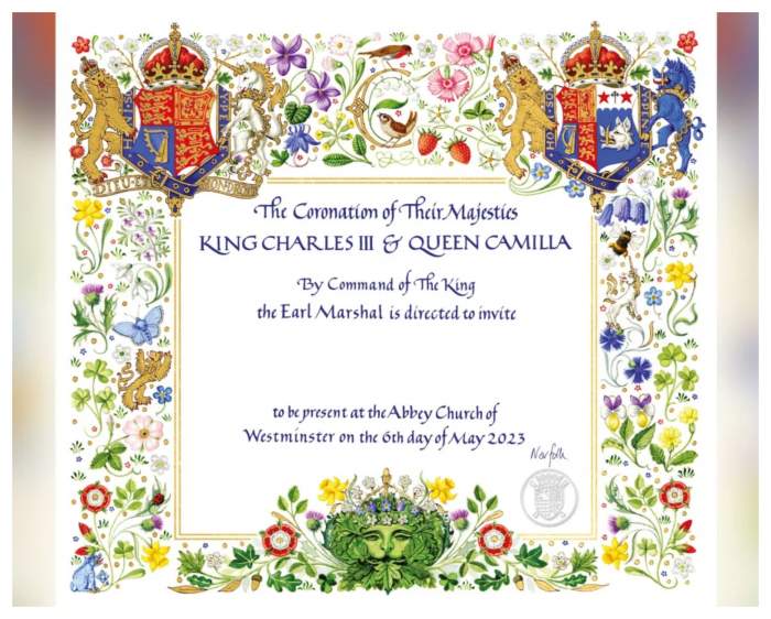 A fost tipărită pe un carton reciclat și include un chenar cu flori sălbatice, stema statului, dar și omul verde din folclorul britanic. Titlul documentului fiind: „Încoronarea majestăților lor Regele Charles al III-lea și Regina Camilla”.