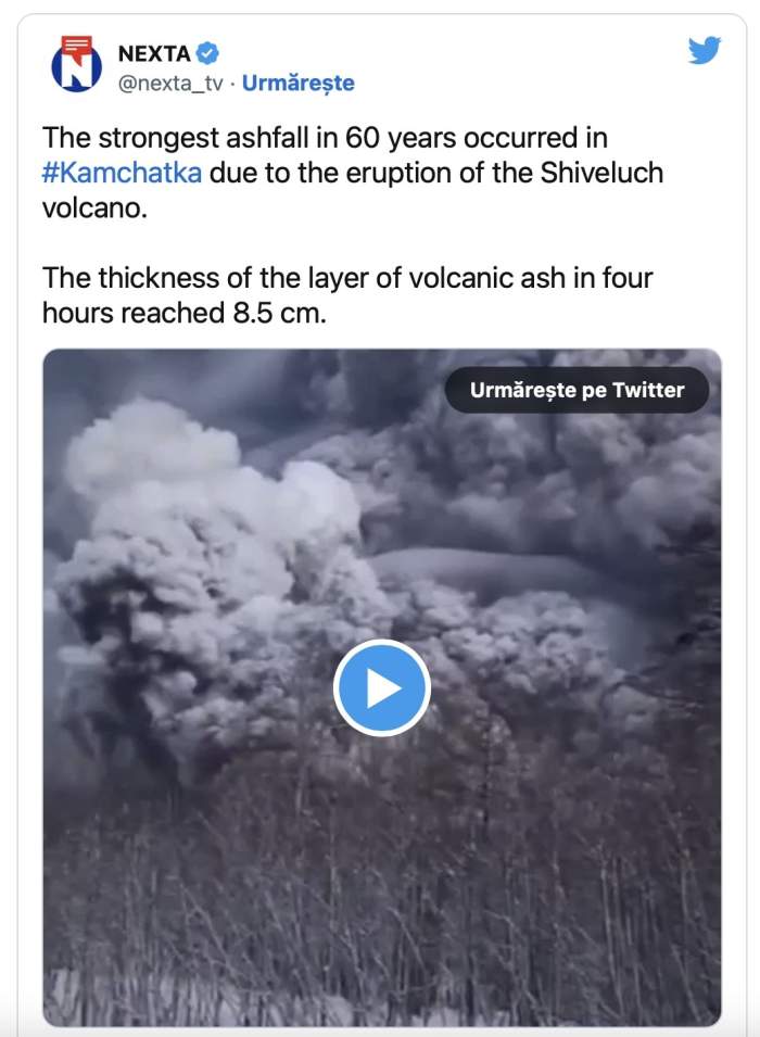 Mai multe videoclipuri postate pe reţelele sociale din regiune arată un nor negru imens pe cer şi cenuşă care acoperă drumurile şi maşinile din oraşul Ust-Kamceaţki, aflat la aproximativ 90 de kilometri de vulcan.