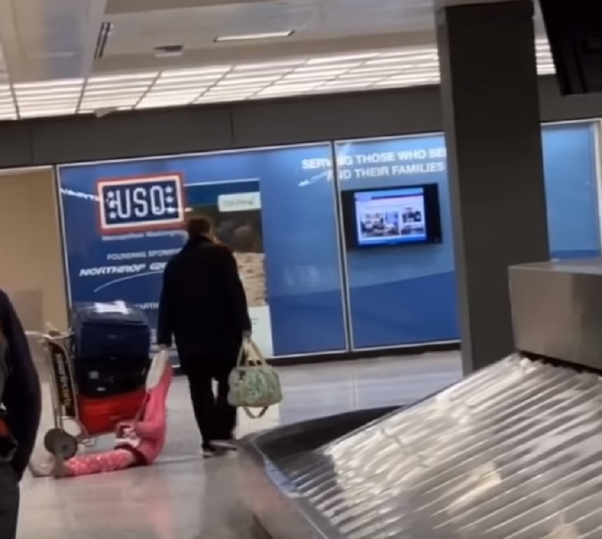 Un bărbat a fost surprins de Anul Nou într-o manieră delicată. Şi-a târât propriul copil ca pe un troller în Aeroportul Internațional Washington Dulles.
