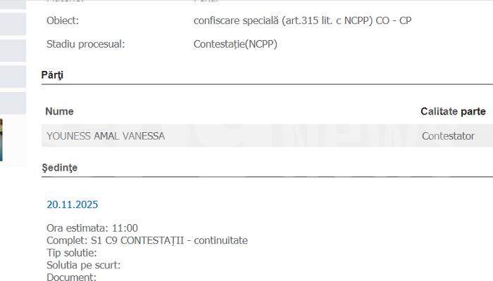 „Dispune confiscarea de la intimata YOUNESS Amal Vanessa a echivalentului în lei a sumei de 1.449.950 de euro. În baza art.275 alin.3 C.proc.pen. cheltuielile judiciare avansate rămân în sarcina statului. Cu drept de contestaţie în termen de 3 zile de la comunicare”, este hotărârea atacată de afaceristă.