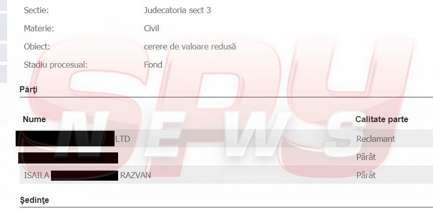 Răzvan Isăilă, victima asasinului plătit Vitalie Proca, are probleme cu legea, din cauza unor datorii pe care care nu le-a achitat. Afaceristul a fost dat în judecată, alături de soție, de o clinică din Capitală, care a susținut că a fost înșelată. Așa că, fără prea multe discuții, judecătorii au dispus: ”Admite în parte cererea formulată de reclamanta (clinica din București - n.r.) în contradictoriu cu pârâții (soția pârâtului - n.r.) și Isăilă Răzvan. Obligă pârâții la plata sumei de 1320 euro, echivalentul în lei la cursul BNR valabil la data plății, reprezentând debit principal, și suma de 1640 euro, echivalentul în lei la cursul BNR valabil la data plății, reprezentând penalități de întârziere. Obligă pârâții la plata sumei de 400 lei, reprezentând cheltuieli de judecată constând în taxă de timbru și onorariu de avocat. Cu drept de apel în termen de 30 zile de la comunicare. Cererea de apel se depune la Judecătoria Sectorului 3 Bucureşti”.