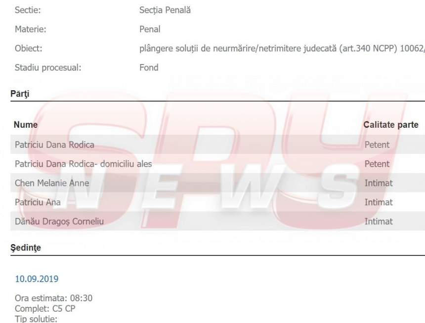 Judecătorii au citat-o pe Melanie Chen la ultima adresă cunoscută, însă, fiindcă aceasta nu s-a prezentat la termene, au dispus efectuarea unor verificări, pentru a fi găsită, precum şi citarea ei la uşa instanţei.