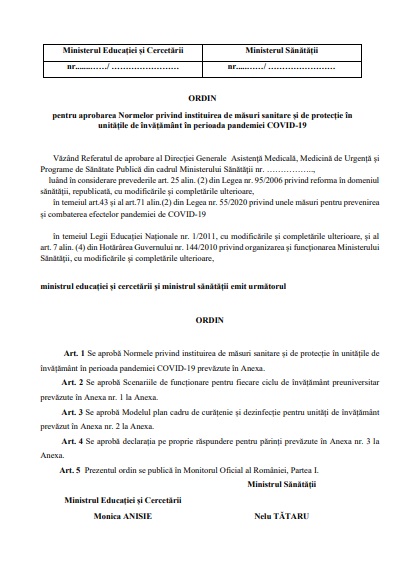 Astfel, în Anexa 4 a draftului înaintat de autorități, se vorbește despre condiționarea accesului pentru elevi prin intermediul acestui document, pentru care a fost oferit și un model, conform edupedu.ro.
