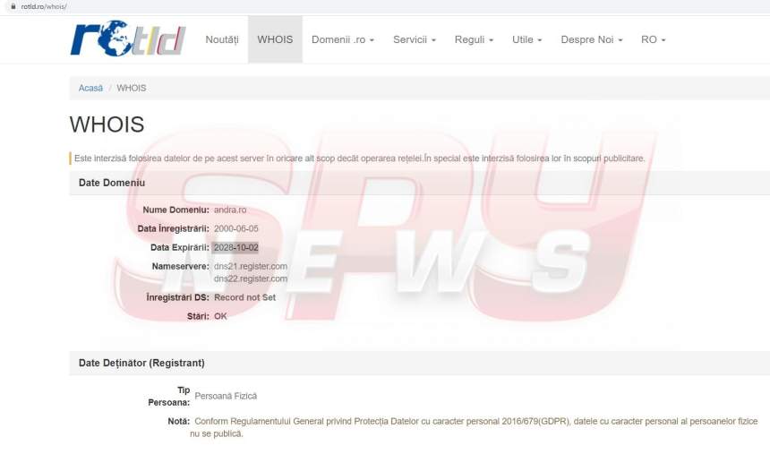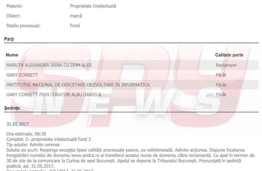 Andra Măruţă s-a luptat în instanţă, luni la rând, cu Gary Corbett, un individ care a sabotat-o, înregistrând domeniul andra.ro, cu toate că artista avea numele de scenă protejat, ca marcă înregistrată. În 2017, SPYNEWS a dezvăluit, în exclusivitate, că Tribunalul Bucureşti i-a dat câştig de cauză artistei, obligându-l pe deţinătorul domeniului andra.ro să îl cedeze artistei. "Admite acţiunea. Dispune încetarea înregistrării numelui de domeniu www.andra.ro şi transferul acestui nume de domeniu către reclamantă. Cu apel în termen de 30 de zile de la comunicare la Curtea de apel Bucureşti. Apelul se depune la Tribunalul Bucureşti", a dispus instanţa. Individul nu a atacat hotărârea, aşa că aceasta a rămas definitivă, însă, zilele trecute, site-ul avea acelaşi proprietar ca şi în 2017, semn că Andra nu a putut să pună în aplicare sentinţa.