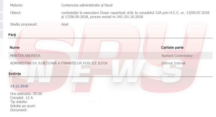 Andreea Mantea trebuie să se prezinte în faţa judecătorilor pe 14 decembrie, într-un dosar deschis chiar de ea împotriva Administraţiei Finanţelor Publice Ilfov. În prima fază a procesului, vedeta a pierdut, însă a decis să meagă până la capăt şi a contestat decizia magistraţilor de la Judecătoria Cornetu. În cererea de chemare în judecată, Mantea solicitase suspendarea unei executări silite şi anularea unor documente emise de Fisc.