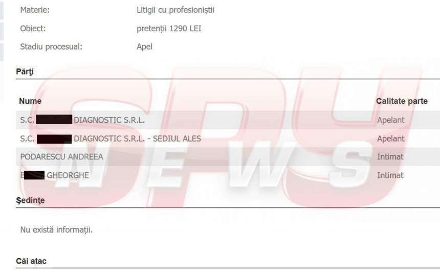 Andreea Podărescu şi Gheorghe B. sunt chemaţi în faţa judecătorilor de la Tribunalul Bucureşti de un laborator de analize medicale specializat în prelucrarea parametrilor necesari unei bănci de celule stem, în vederea prelucrării şi stocării probelor. Reprezentanţii clinicii au decis să îi cheme la bară pe cei doi după ce au constatat că aceştia au “uitat” să achite o factură de aproape 1.300 de lei, iar la procesul de fond au obţinut obligarea pârâţilor la plata datoriei.
