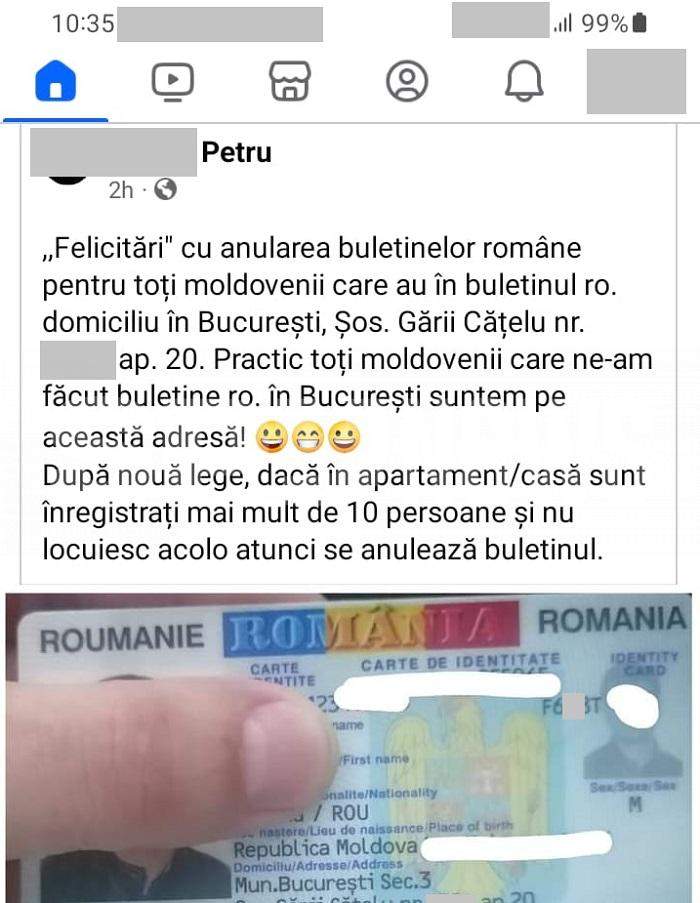 „Felicitări cu anularea buletinelor române pentru toți moldovenii care au buletinul în România. (...) Practic, toți moldovenii care ne-am făcut buletine românești în București suntem pe această adresă”, este mesajul basarabeanului căruia i s-a confiscat cartea de identitate de polițiștii de la Punctul de Trecere a Frontierei Petea, județul Satu Mare.