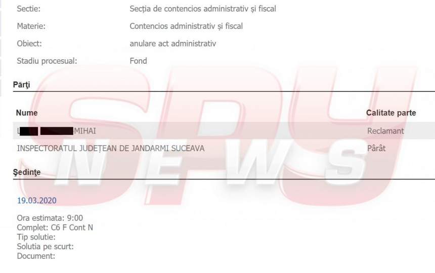 „Fostul angajat al Inspectoratului de Jandarmi Judeţean (IJJ) Suceava a demisionat din proprie iniţiativă. S-a prezentat la sediu şi a depus demisia, nu i-a sugerat nimeni să facă acest lucru. Ulterior a revenit asupra deciziei şi a deschis un proces împotriva IJJ, susţinând că nu a vrut să demisioneze. Aşteptăm hotărârea instanţei”, au declarat, în exclusivitate pentru SPYNEWS, surse din conducerea Inspectoratului de Jandarmi Judeţean „Bogdan Vodă” Suceava.