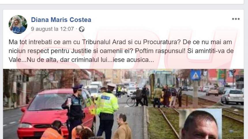 Diana Mariş Costea şi-a exprimat de mai multe ori nemulţumirea faţă de modul în care a fost instrumentat dosarul crimei, însă, postarea publică de acum câteva zile a reuşit să-şi lase prietenii mască: „Mă tot întrebaţi ce am cu Tribunalul Arad şi cu Procuratura? De ce nu mai am niciun respect pentru Justiţie şi oamenii ei? Poftim răspunsul! Şi amintiţi-vă de Vale... Nu de alta, dar criminalul lui... iese acuşica..."