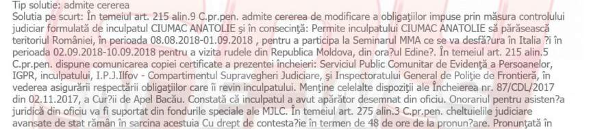 În timp ce procurorii DIICOT încearcă să-l trimită ani grei după gratii, Tolea a plecat din ţară, cu aprobarea judecătorilor. După ce a explicat în faţa instanţei că trebuie să participe la o competiţie sportivă în Italia şi că îi este foarte dor de rudele sale din Republica Moldova, magistraţii i-au dat o "permisie" la care Tolea nici nu visa. "Admite cererea de modificare a obligaţiilor impuse prin măsura controlului judiciar formulată de inculpatul CIUMAC ANATOLIE şi în consecinţă: Permite inculpatului CIUMAC ANATOLIE să părăsească teritoriul României, în perioada 08.08.2018-01.09.2018 , pentru a participa la Seminarul MMA ce se va desfăşura în Italia şi în perioada 02.09.2018-10.09.2018 pentru a vizita rudele din Republica Moldova, din oraşul Edineţ", au dispus judecătorii din Bacău.