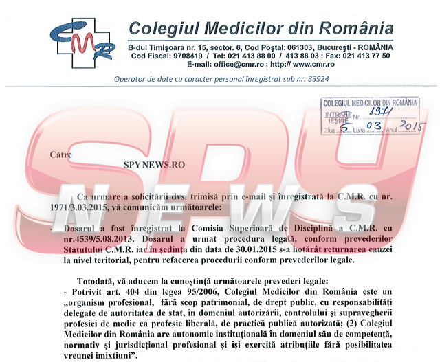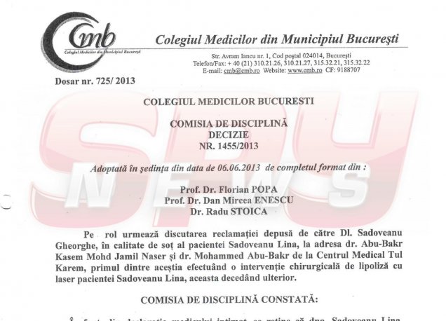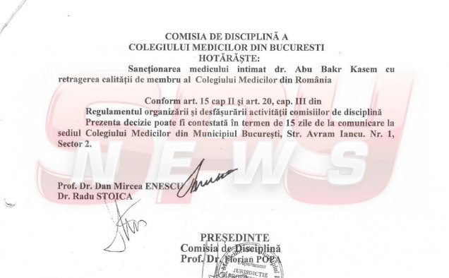 Colegiul Medicilor, care l-a lăsat timp de cinci ani pe Kasem să opereze ilegal motiva decizia luată în 2013, pentru SPYNEWS: "Comisia de Disciplină, analizând înscrisurile medicale folosite ca probă şi documentele cercetate şi reţinute în soluţionarea cauzei, ca măsuri de cercetare a faptei constată că medicul intimat şi-a depăşit competenţa prin operaţia efectuată, fără a avea calitatea de medic specialist. A efectuat o procedură chirurgicală cu risc pentru care nu avea pregătirea profesională necesară, nu a acordat corect îngrijiri postoperatorii pacientei (tratament anticoagulant în vederea prevenţiei unei complicaţii previzibile în urma unei astfel de operaţii, precum CID) şi a delegat, în mod necorespunzător, asistenta medicală pentru efectuarea consultului. De asemenea, se constată deficienţe de formă ale actului medical, absenţa consimţământului informat, deficienţe în întocmirea documentelor medicale, toate acestea contravenind prevederilor art. 5, art. 11, art. 25 şi art. 35 alin (1) din Codul de Deontologie Medicală".