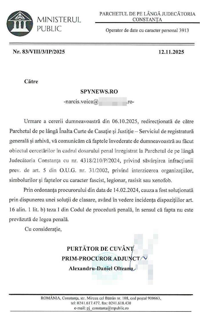 După ce presa din Constanța a dezvăluit că polițista Elena N., de la IPJ Constanța, a „propovăduit” în spațiul public mesajul de mai jos al lui Corneliu Zelea Codreanu, iar autoritățile au anunțat că s-au sesizat din oficiu și au întocmit un dosar penal, reporterii SPYNEWS.ro au solicitat Poliției și Parchetului să explice care a fost rezultatul anchetei.