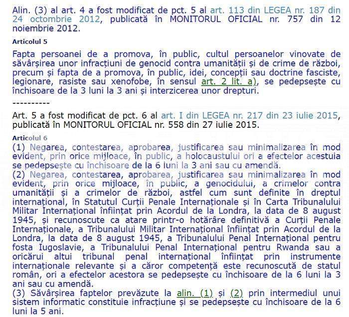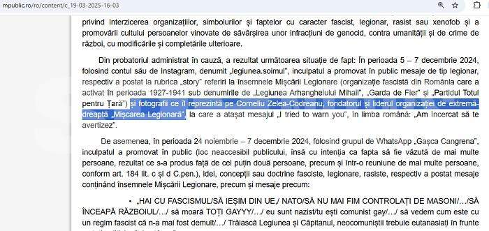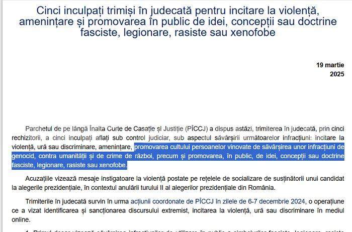 Asta, în condițiile în care Parchetul General se lăuda, recent, că a trimis în judecată niște oameni, pentru „incitare la violență, ură sau discriminare, amenințare, promovarea cultului persoanelor vinovate de săvârșirea unor infracțiuni de genocid, contra umanității și de crime de război, precum și promovarea, în public, de idei, concepții sau doctrine fasciste, legionare, rasiste sau xenofobe”.