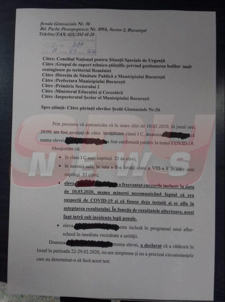 Un document obținut de Spynews.ro arată că fiica unui femei diagnosticată cu coronavirus a fost la școală până marți, 10 martie. Femeia, una dintre cele două persoane întoarse din Israel, nu a anunțat că este suspectă ori că a fost testată pozitiv.