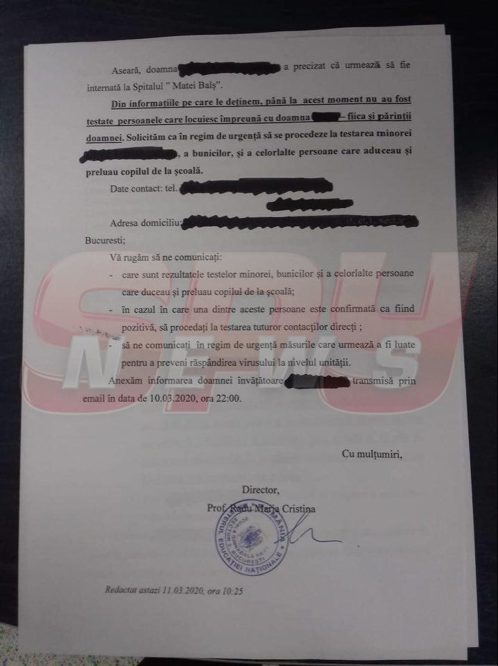Contactați de Libertatea, reprezentanții școlii au confirmat că „documentul este veridic. Știm că mama este internată la Spitalul Matei Balș din Capitală, iar în acest moment, se fac testele pentru a se stabili dacă și fiica a luat infecția de la mama ei”.
