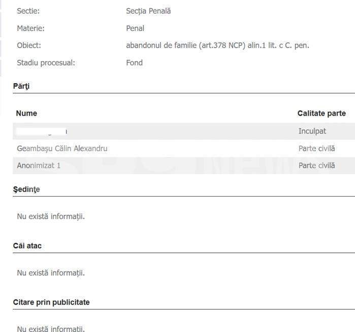 Pe de altă parte, Călin Geambașu o acuză pe fosta parteneră și de comiterea infracțiunii de sesizare nejustificată a organelor judiciare (denunț calomnios – n.r.), dosare în care artistul a fost declarat nevinovat.
