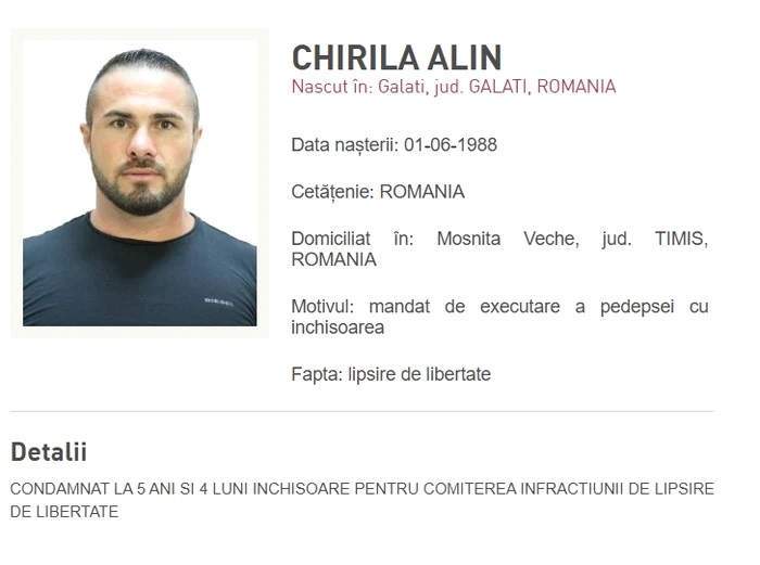 În primă instanță, Alin Chirilă primise o pedeapsă totală de... zece luni şi 20 de zile, cu suspendare, precum și o amendă penală de 8.100 de lei. Victima fraților Chirilă a contestat hotărârea, iar instanța superioară a decis, printr-o hotărâre definitivă, ca luptătorul MMA să execute cinci ani și patru luni. Pentru că nu s-a prezentat la penitenciar, fostul concurent Survivor a fost dat în urmărire generală și a fost încarcerat după ce s-a predat.