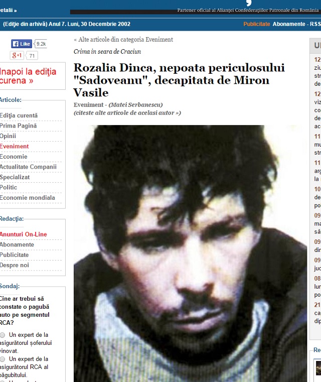 În 2014, când a intrat peste Raluca Macovei în casă, Vasile Miron abia fusese eliberat condiţionat, pentru o crimă comisă în 2003. În seara de Crăciun a anului 2003, a atacat-o pe Rozalia Dincă (17 ani), nepoata lui Cristian Mitrache, zis Sadoveanu, unul dintre liderii puternicului clan ţigănesc al "Belgienilor". Fata a dispărut fără urmă, aşa că tatăl tinerei, Ioan Dincă, membru al clanului "Belgienilor", a anunţat Poliţia din localitate că fiica sa, care plecase la colindat în seara zilei de 25 decembrie, nu s-a mai întors. Fata fusese ucisă de Miron, după o tentativă de viol. În încercarea de a scăpa de cadavru, Vasile Miron a decapitat-o pe fată şi a aruncat trupul în haznaua din curtea casei. Vasile Miron a fost prins după câteva zile, de poterele ţigăneşti, care îl căutau prin oraş, să îl omoare. A scăpat ca prin minune din mâinile interlopilor. Salvat de poliţie, a recunoscut fapta. Condamnat definitiv în 2004, la 15 ani de puşcărie, a fost eliberat în 2014.