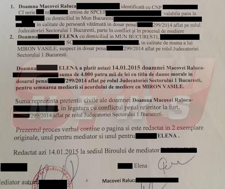La patru ani de la fapta care l-a readus pe prima pagină a ziarelor pe criminalul Vasile Miron ies la iveală amănunte şocante. Individul despre care SPYNEWS a relatat în exclusivitate (vezi articolul aici) că a atacat-o pe Raluca Macovei în propria locuinţă şi-a cumpărat libertatea cu 5.000 de lei. Arestat la momentul respectiv, Vasile Miron şi-a rugat mama să îl salveze, iar femeia a contactat-o, potrivit declaraţiei acesteia, pe Raluca Macovei, pentru a-i cerşi milă. Ieri, mama criminalului a dezvăluit, în exclusivitate pentru SPYNEWS, că vedeta şi-a retras plângerea, însă nu gratis.