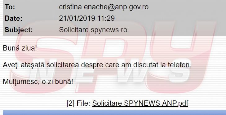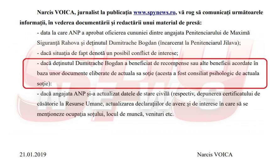 Aceasta este solicitarea transmisă către ANP de SPYNEWS, la data de 21 ianuarie a.c., imediat după ce SPYNEWS a dezvăluit, în exclusivitate, că psiholoaga de la Rahova s-a măritat cu un mafiot închis la Jilava!