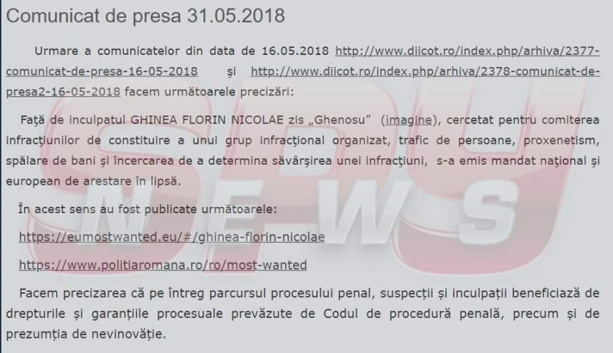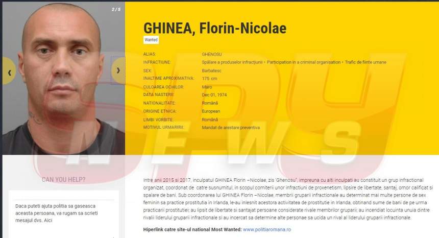 Ghenosu a fost dat în urmărire la două sptămâni după ce a fugit de sub nasul procurorilor, în timpul unor descinderi de amploare care vizau destructurarea grupării interlope pe care o conduce de câţiva ani. Conform DIICOT, el e cercetat pentru comiterea infracţiunilor de constituire a unui grup infracţional organizat, trafic de persoane, proxenetism, spălare de bani şi încercarea de a determina săvârşirea unei infracţiuni.