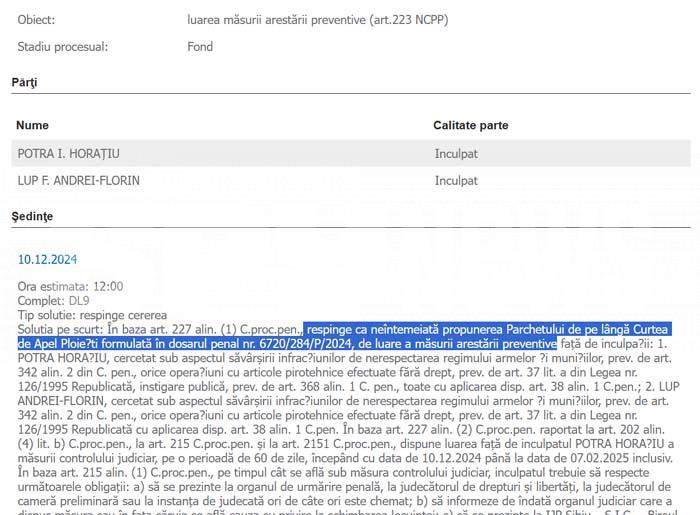 SPYNEWS.ro a dezvăluit, în premieră, și detalii despre dosarul în care Horațiu Potra cerea unei bănci să îi deblocheze conturile. „Respinge cererea. Solutia pe scurt: Dosar nr. 2724/85/2024 HOT. 27.11.2024 Respinge cererea de ordonanţă preşedinţială ca neîntemeiată. Cu drept de apel în termen de 5 zile de la pronunţare. Cererea de apel se depune la Tribunalul Sibiu. Pronunţată prin punerea soluţiei la dispoziţia părţilor prin grefa instanţei, azi, 27.11.2024”, este hotărârea atacată de Potra, proces în care acesta este citat la Curtea de Apel Alba Iulia pe 14 ianuarie 2025.