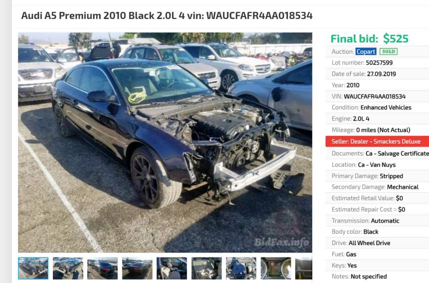 Etichetată „daună totală”, mașina a fost scoasă la vânzare inițial la prețul de 2.700 de dolari, însă cum nu s-au înghesuit cumpărătorii, prețul a scăzut, pentru ca, în final, mașina să fie dată pe 525 de dolari.