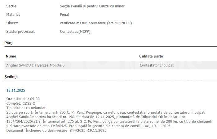 Cumătrul lui Mircea Băsescu a contestat măsura, însă instanța superioară a decis, ieri: „Respinge, ca nefondată, contestaţia formulată de contestatorul inculpat Anghel Sandu împotriva încheierii nr. 198 din data de 12.11.2025, pronunţată de Tribunalul Olt în dosarul nr. 1254/104/2025/a1.8. Obligă contestatorul la plata sumei de 200 lei, cu titlu de cheltuieli judiciare avansate de stat. Definitivă. Pronunţată în şedinţa din camera de consiliu, azi, 19.11.2025”.