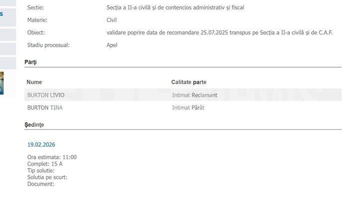 Dosarul rămas acum în aer are legătură cu procesul în care, alături de un alt afacerist, Livio Burton, a executat-o silit pe fosta soție, Tina Burton, alias „Regina imobiliarelor”.