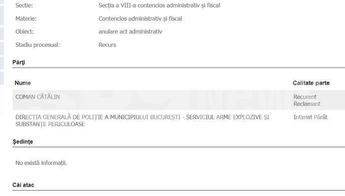 „Respinge cererea de chemare în judecată, ca neîntemeiată. Cu drept de recurs în termen de 15 zile de la comunicare, cerere care se depune la Tribunalul Bucureşti - Secţia a II-a Contencios Administrativ şi Fiscal. Pronunţată prin punerea soluţiei la dispoziţia părţilor de către grefa instanţei”, este hotărârea atacată de polițistul (r.) Cătălin Coman.