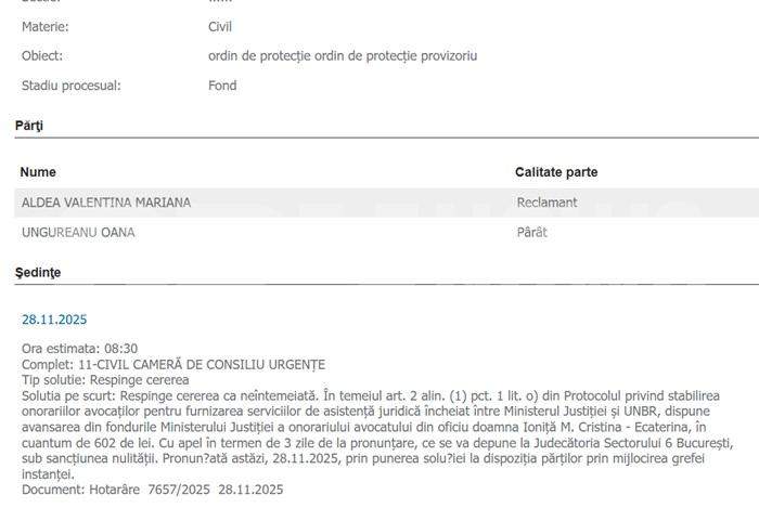2-0 în „meciul” dintre Oana Ungureanu și senatoarea Valentina Mariana Aldea (foto jos), care încerca să obțină un ordin de protecție, după scandalul teribil de la finele anului trecut. Senatoarea Aldea acuza faptul că Oana Ungureanu ar fi agresat-o și, invocând o stare de temere, a solicitat ca soția prietenului ei să stea la distanță de ea.