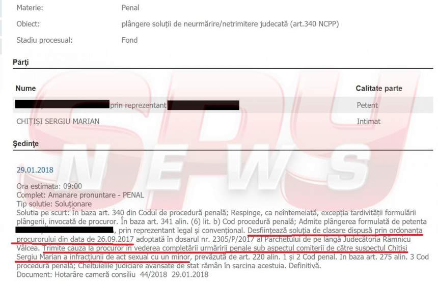 După ce au fost obligaţi să redeschidă dosarul, procurorii au "efectuat cercetări" şi l-au clasat din nou, după câteva luni. Şi de această dată, avocatul Laurenţiu Cazan a contestat ordonanţa de clasare, iar judecătorii i-au dat iarăşi dreptate şi au cerut ca violatorul Chiţişi (între timp celălalt suspect murise, după ce i-a crăpat inima, la propriu) să fie cercetat pentru act sexual cu un minor.