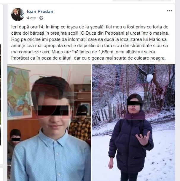În decembrie 2018, imediat după ce copilul său a fost răpit de doi rakeţi tocmiţi de fosta lui soţie, Ioan Prodan, din Petroşani, a declarat, în exclusivitate pentru SPYNEWS: "Miercuri, la ora 14.00, Mario m-a sunat şi mi-a zis că a plecat de la şcoală. I-am zis să ia un taxi, însă el a insitat să vină pe jos, fiindcă ninsese şi a zis că vrea să se plimbe prin zăpadă. Pentru că locuim la aproximativ un kilometru de şcoală, am plecat în întâmpinarea lui. Pe la 14.20, l-am sunat, fiindcă deja mă apropiasem de şcoală şi nu ne întâlniserăm, însă nu a mai răspuns la telefon. Am aflat că l-au luat cu forţa, de pe stradă, doi bărbaţi, care l-au băgat într-o maşină şi au dispărut fără urmă".